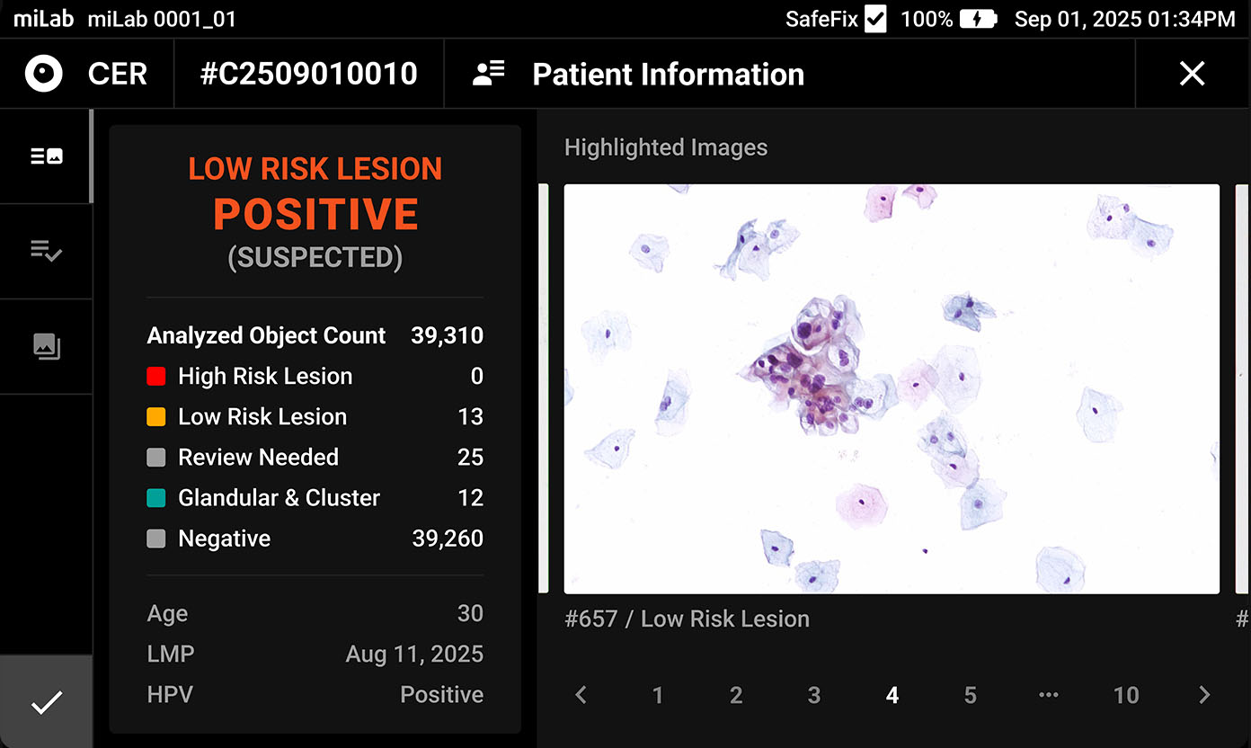 자궁경부암 진단 솔루션 miLab™ CER은 자궁경부세포검사의 복잡한 공정과 전문 인력 의존도를 대폭 줄이며, 고품질 진단을 자동화한 혁신적인 디지털 세포진 솔루션으로 주목받고 있습니다. miLab™ CER은 WHO-UNITAID 공동 기술현황 보고서(2024)*에서 AI 기반 알고리즘을 통해 Bethesda 체계에 따라 세포진 결과를 슬라이드 단위로 제공하는 컴퓨터 보조 세포진 진단 시스템으로 언급되었습니다.