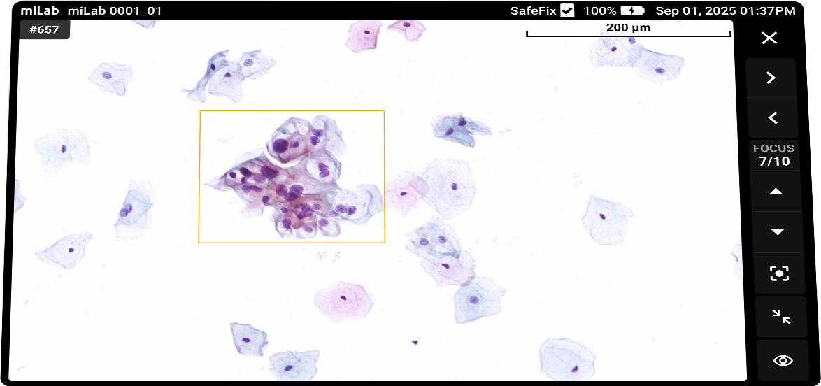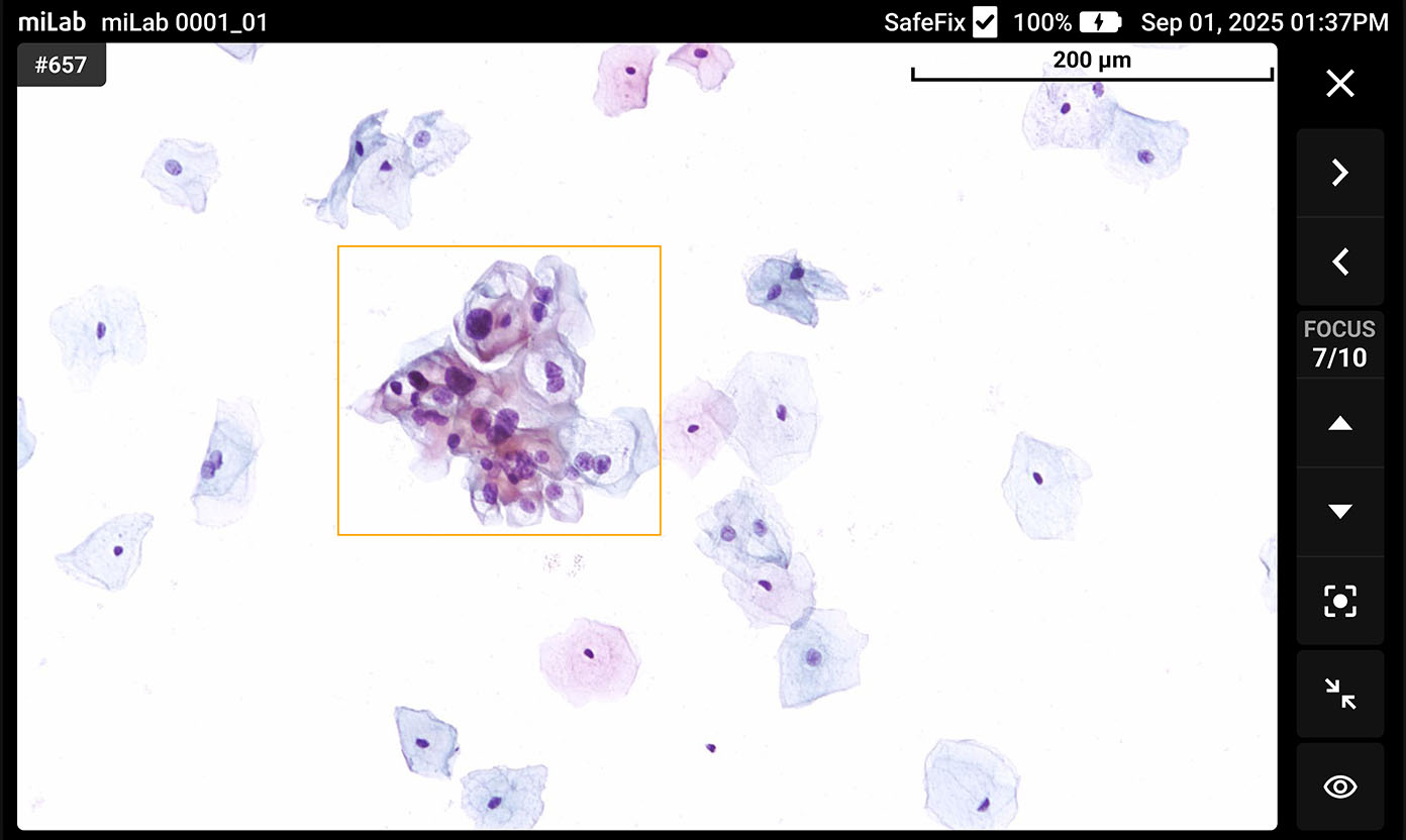 - Pap smear 검사에 대한 정확도를 높이고자 하는 의료기관에서는 miLab™ CER을 품질 관리 체계에 포함할 수 있습니다. miLab™ CER은 Papanicolaou 염색부터 AI 분석까지 Pap smear의 핵심 과정을 표준화하였습니다. 따라서 전문 인력이 수행한 Pap smear 검사 결과와 miLab™ CER 결과를 비교함으로써 전문 인력의 검사 결과 신뢰도를 확인할 수 있습니다. 또한, 숙련도가 낮은 전문 인력에게는 miLab™ CER에서 생성된 디지털데이터를 교육/훈련 자료로 활용할 수도 있습니다.